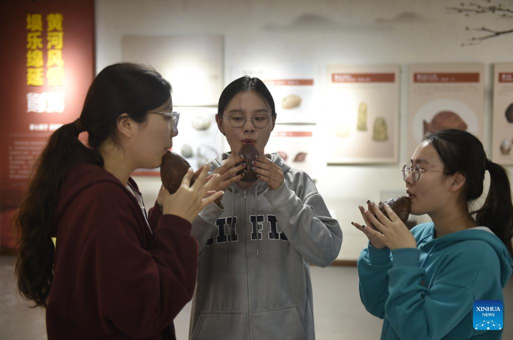 Students practice pottery Xun playing at the Huanghe Cultural Center of Huanghe Jiaotong University in Wuzhi County, central China's Henan Province, Oct. 31, 2023. (Xinhua/Li Jianan)