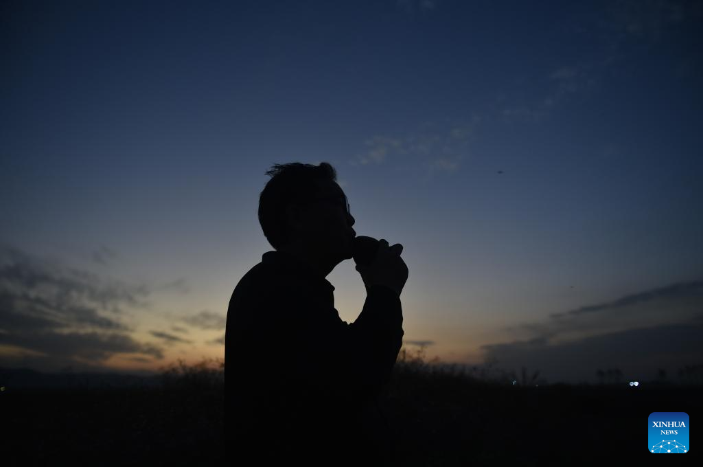 Wang Jian plays a pottery Xun on the banks of the Yellow River in Wuzhi County, central China's Henan Province, Oct. 31, 2023. (Xinhua/Lu Peng)