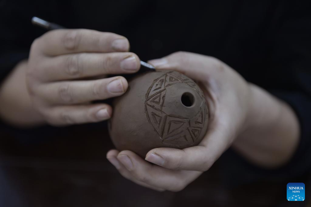 Wang Jian makes a pottery Xun at a studio in Huanghe Jiaotong University in Wuzhi County, central China's Henan Province, Oct. 31, 2023. (Xinhua/Lu Peng)