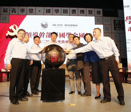 10月17日,作为首届孔学堂·国学图书博览会的主体活动之一,“领导干部学国学全国行·走进贵州贵阳”启动仪式在贵阳孔学堂阳明大讲堂举行,与会嘉宾围绕“领导干部如何读经典、学国学”的话题,与现场读者分享、互动。