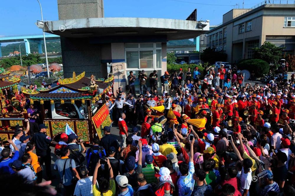 9月23日下午3时,湄洲妈祖金身在经历3小时的海上航行后抵达台北港。顶着烈日接驾的信众超过千人。“到了到了,妈祖娘娘的銮驾到了。”23日下午,家住台湾新北市八里台北港的陈柏蓉领着母亲和孩子,顶着34摄氏度高温,挤在人群中,虔诚地迎接湄洲妈祖金身驾临。蒋雪林 摄