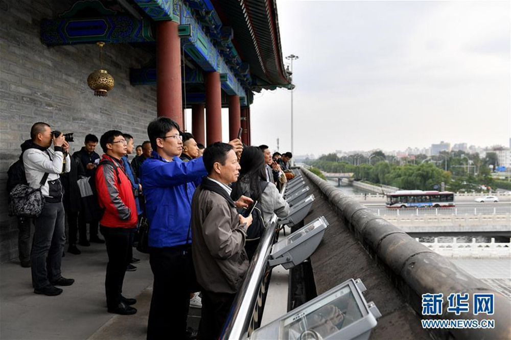 10月12日,记者团在北京永定门城楼上参观。当日,十九大新闻中心组织首场外出参观采访活动,25家境内外媒体35名记者,沿着北京中轴线参观了永定门城楼、景山、钟鼓楼、奥林匹克塔等经典建筑,了解古都北京的历史沿革,感受党的十八大以来古都焕发出的生机活力。 新华社记者 李鑫 摄 图片来源:新华网