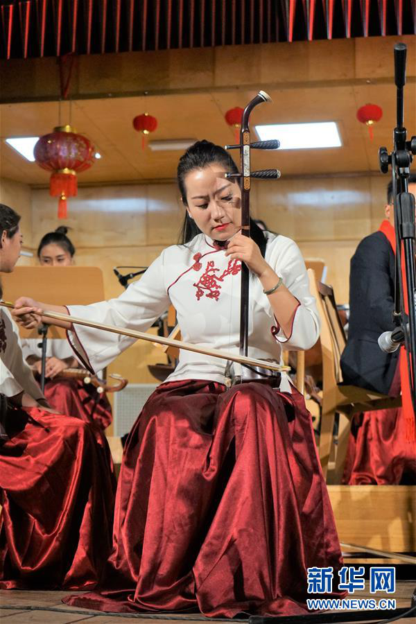 1月18日,在波兰奥波莱,演员肖晶表演二胡独奏《葡萄熟了》。 当天,2020“欢乐春节”民族交响乐《魅力丝路·陇上行》活动在波兰奥波莱举办,来自甘肃省歌舞剧院民族交响乐团的音乐家们为当地观众献上了一场极具中国传统文化韵味的新春音乐会。(新华社记者 陈序 摄)