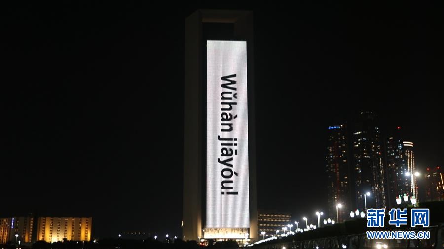 2月2日,在阿联酋阿布扎比,当地地标建筑物阿布扎比国家石油公司大楼显示出“武汉加油”的汉语拼音,为中国抗击新型冠状病毒感染的肺炎疫情加油。 新华社/阿联酋通讯社