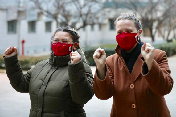 2月1日,武汉大学哈萨克斯坦留学生Elvira Zhaidarova和俄罗斯留学生Svetlana Zhigalova 高喊:“武汉,加油!” (中国日报记者 朱兴鑫 摄)