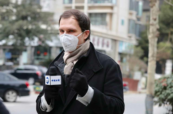 2月1日,华中科技大学荷兰留学生Gerard Buis高喊:“武汉,加油!” (中国日报记者 朱兴鑫 摄)