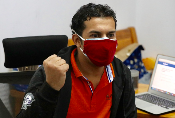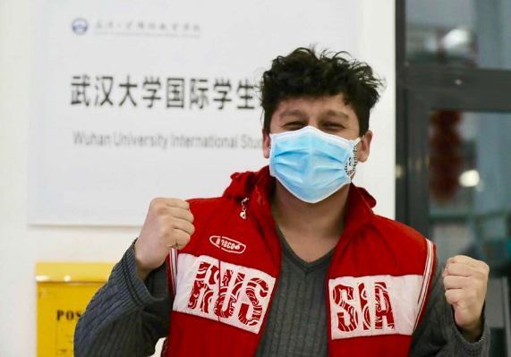 2月1日,武汉大学留学生Davlatov Khairiddin高喊:“武汉,加油!” (中国日报记者 朱兴鑫 摄)
