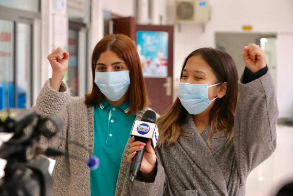 2月1日,武汉大学俄罗斯留学生茉莉Shashikian Mane和留学生李佳怡Oorzhak Anzhelika一起高喊:“武汉,加油!” (中国日报记者 朱兴鑫 摄)