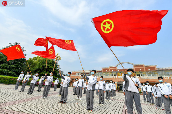 2020年5月2日,浙江省湖州市长兴职教中心,青年学生代表挥舞团旗,高唱团歌。