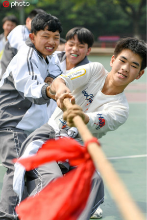 2020年5月2日,浙江省湖州市长兴职教中心,青年学生正在进行拔河趣味运动。