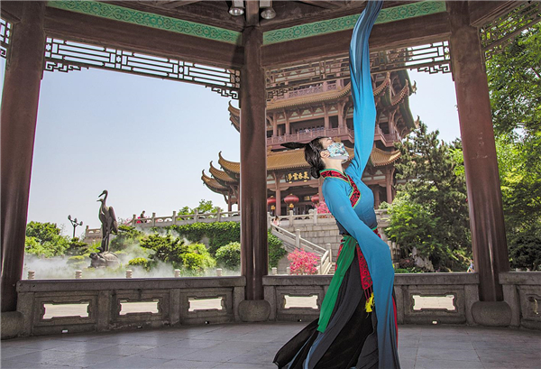 4月29日,黄鹤楼恢复有限开放。一名舞蹈演员在黄鹤楼前翩翩起舞。