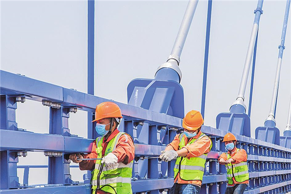 4月26日,中铁大桥局施工人员正在对青山长江大桥护栏进行矫正。