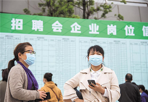 4月21日,东西湖五环体育中心,求职者在查询岗位信息。