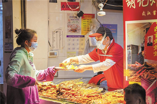 随着连续三波武汉消费券的投放以及各大商圈推出叠加优惠活动,不少市民走出家门,提包购物,大街小巷慢慢热闹起来。在光谷步行街大洋百货,顾客自觉间隔着一定距离排队,等候扫码、测量体温、手部消毒后进场。湖北日报全媒记者在现场看到,商场入口和各商家柜台,均配置有免洗酒精消毒液,供有需要的顾客取用。楚河汉街,一改之前的人流稀少,重现顾客排队等待消费场景。
