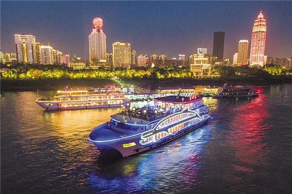 4月25日晚,武汉长江粤汉码头,“东湖号”和“牡丹号”游船先后驶离码头开始试运营。