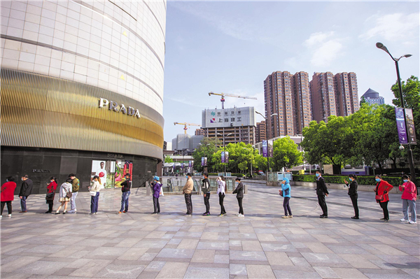 4月19日,武商广场,市民排队进入商场。