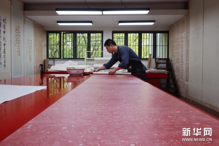 5月13日,古籍修复师在对书画作品进行装裱操作。