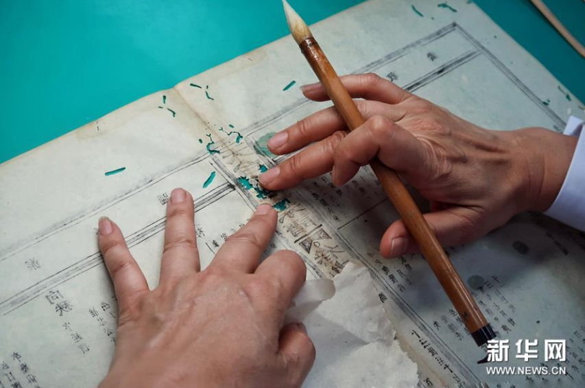 5月13日,古籍修复师在对书页进行修复。新华社记者 郑梦雨 摄