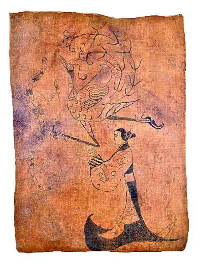 《人物龙凤图》又名《人物龙凤帛画》,出土于湖南长沙陈家大山楚墓,现藏于湖南博物院。该画为战国时期楚国葬仪中所用的旌幡,距今已有两千余年的历史,是目前我国现存最早的帛画作品。《人物龙凤图》的左上画有翩飞的龙凤,其下有一弯月状物。画面右下方描绘了一位虔诚祝祷的女子,端庄华贵,展现出战国时期楚国文化神秘浪漫的特点。同时,这一女性形象的描绘也从侧面透露出特定时代背景下对女性的审美偏好与女性群体的生存处境。