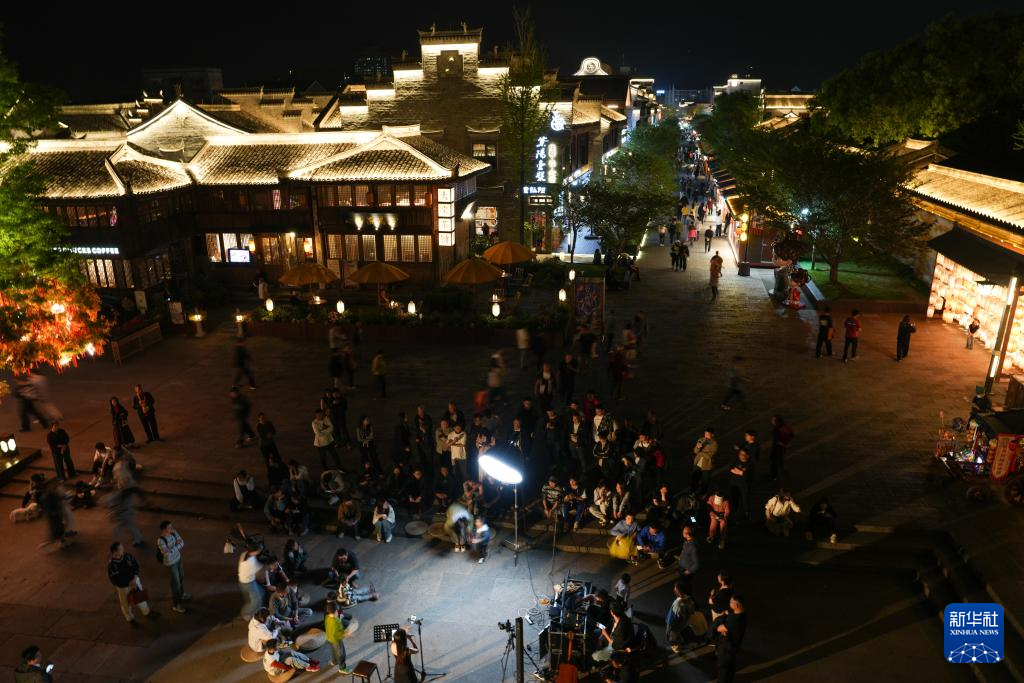 4月8日,人们在浙江省临海市台州府城文化旅游区欣赏一场露天音乐会。新华社记者 郑焕松 摄