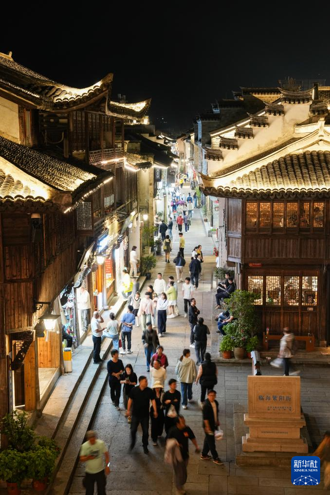 浙江省临海市台州府城文化旅游区总面积3.12平方公里,包括台州府城墙、紫阳古街、东湖、巾山等景点,是浙江省保存较为完好的文化古城之一。入夜后,众多市民游客前往台州府城文化旅游区,感受古城文化韵味与人间烟火味的交融。