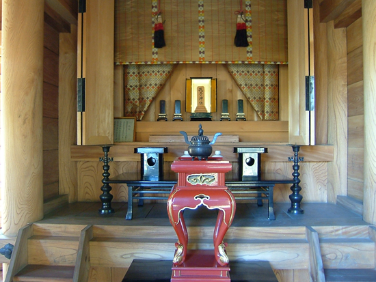 殿内深处中央日式神龛里供奉的不是孔子像,而是“孔子神位”,两侧分别为四哲的牌位。殿内外的建筑木材也没有涂成黑漆,而是原色。另外大成殿及其入口正门朝西,即曲阜至圣庙方向。这一朝向也与汤岛圣堂大成殿不同,而与鹿岛神社的神殿面向其本社西北方向的建制一致。