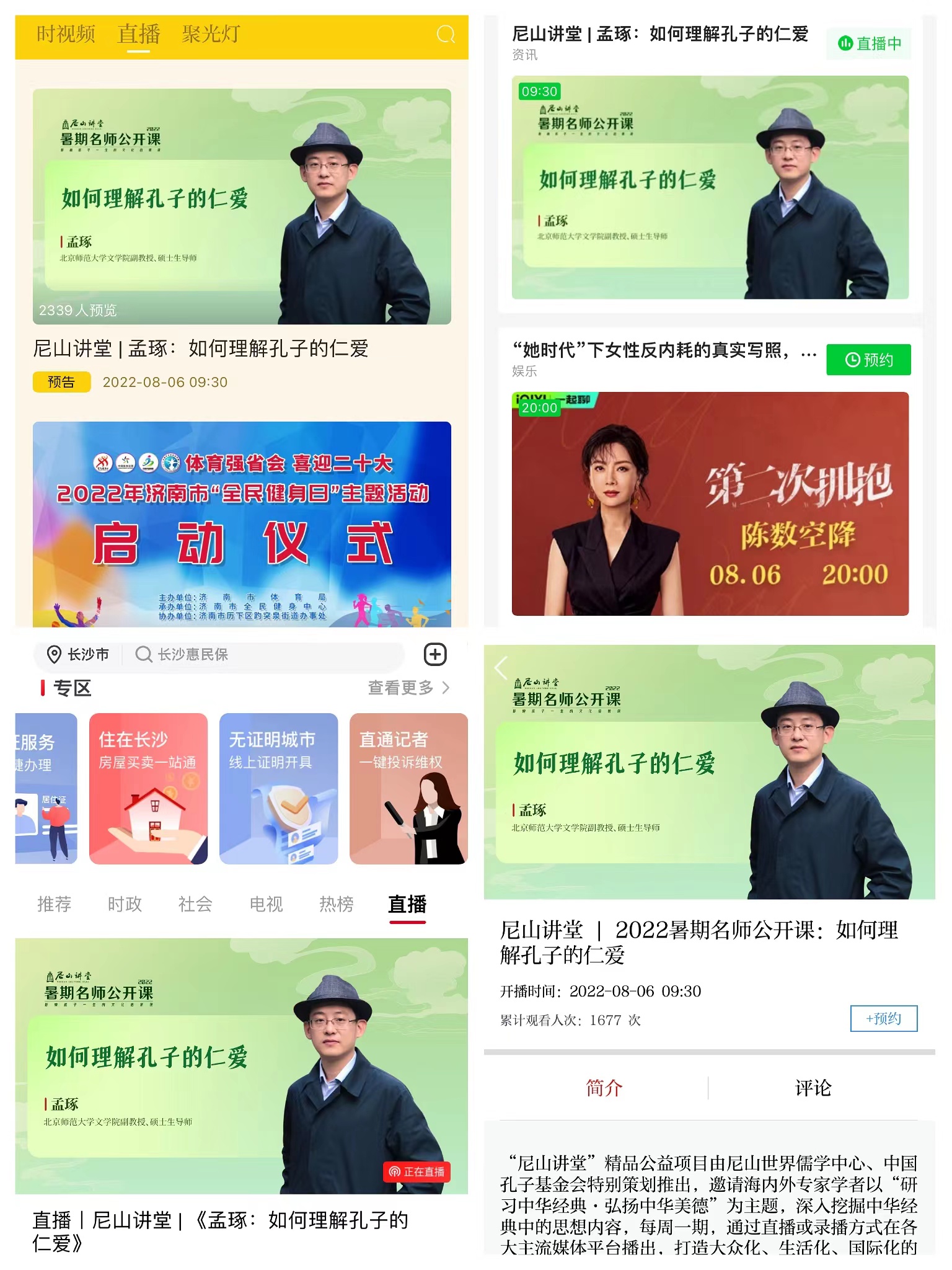 本次公开课,通过央视频、中国孔子网、孔子网客户端、中国网、海报新闻客户端、新黄河客户端、舜网、爱济南客户端、内蒙古广播电视台奔腾融媒、我的长沙客户端、爱奇艺直播、YY直播、KK直播等近20家媒体、网络平台进行了同步直播。
