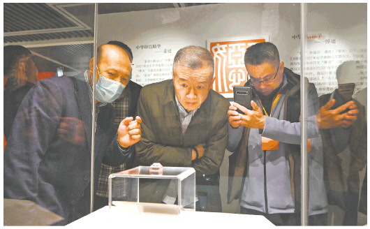 3月20日,首届中华印信文化精品展在孔子博物馆开幕。图为游客在展览上观赏古今篆刻作品。