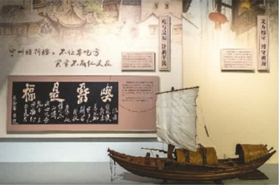 走进序厅,一艘气派的古商船模型映入眼帘,与两旁展墙上铜制浮雕航运图景呼应,展现了洪江古商城繁盛时期商船云集、百货流通的景象,令人震撼。