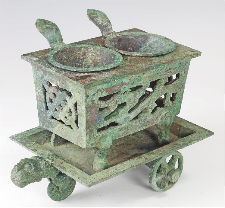 你且看,它由上下两部分组成,上部是灶台,下部是可移动的三轮车,这一个车载灶台的组合可不得了!可以走哪儿吃哪儿,还能边吃边走。再来看,它主体是炭炉,左侧饰镂空龙纹,右侧饰镂空螭虎纹,前后镂空,皆为钱币纹饰。燃炭的烟气通过镂空的部分散出,与锅中升腾的热气相遇,形成烟雾缭绕、瑞兽(龙虎)相伴的饮食环境。