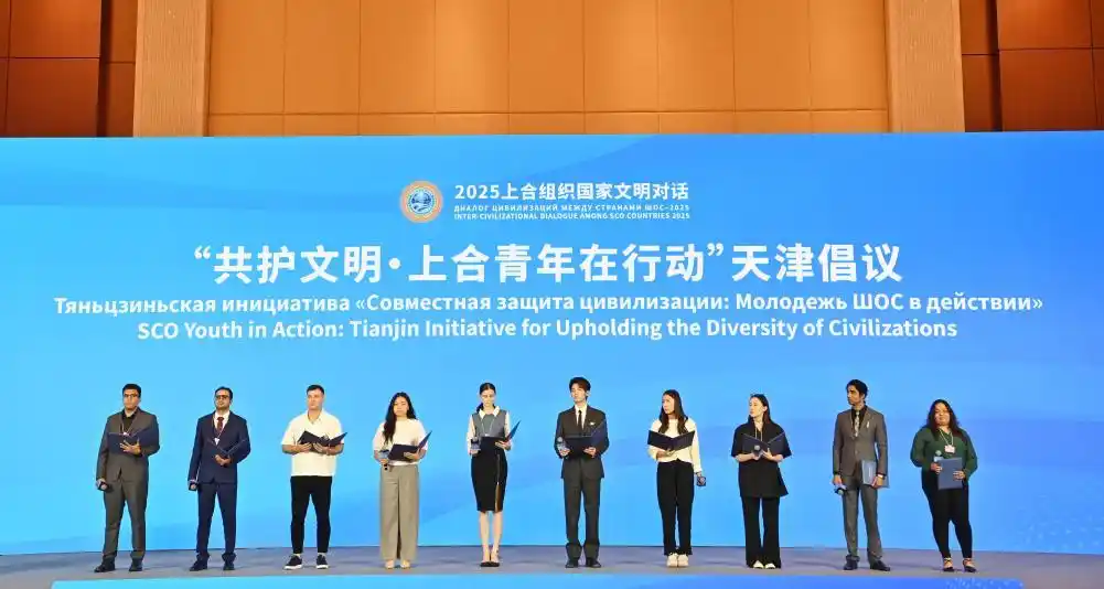 7月23日在2025上合组织国家文明对话现场拍摄的“共护文明·上合青年在行动”天津倡议发布环节。当日,由国务院新闻办、中国外文局、上合组织秘书处联合主办的2025上合组织国家文明对话在天津举行。新华社记者李然 摄