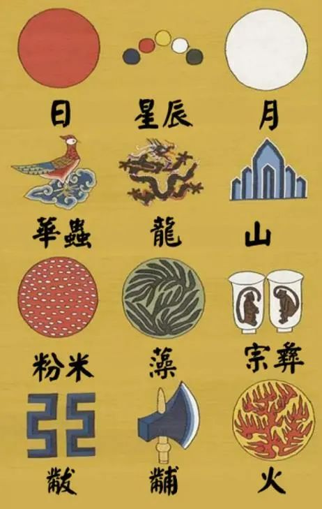 冕服作为礼服的代表,是吉礼时所穿。它精美端庄,纹章丰富,冕冠、玄衣、纁裳、白罗大带、黄蔽膝、素纱中单、赤舄等绣有多种纹章。不同纹章寄寓着不同的内涵和深意。以天子冕服“十二纹章”为例,其玄衣肩部织有日、月、龙;袖部纹有火、华虫、宗彝;背部织有星辰与山;纁裳绘藻、粉米、黼、黻;中单、蔽膝则绘有藻、粉米、黼、黻。其中,日、月、星辰象征养成万物;山、龙表示济众以配天;火喻示明理崇礼;虎表示威猛;黼象征果决。