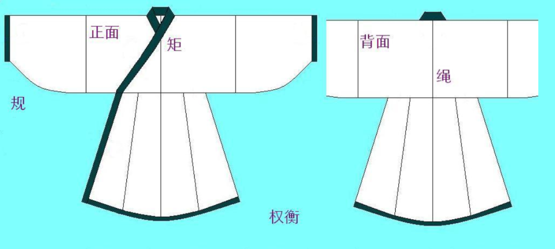 深衣“规、矩、绳、权、衡”的设计形制,每一个细节无不是道德的告诫。“规者,行举手以为容。”(《礼记·深衣》)用袖口象征圆规,是因为人们行为举止都是通过举手来表示,提醒人们要守规矩,依礼而行。“负绳抱方者,以直其政,方其义也。”(《礼记·深衣》)背负着绳,胸怀着矩,是要让人依道而行,为政不偏,以义行事,直而且方。“下齐如权、衡者,以安志而平心也。”(《礼记·深衣》)裳的下缉如秤,提醒人们要安定志向,平衡心情。