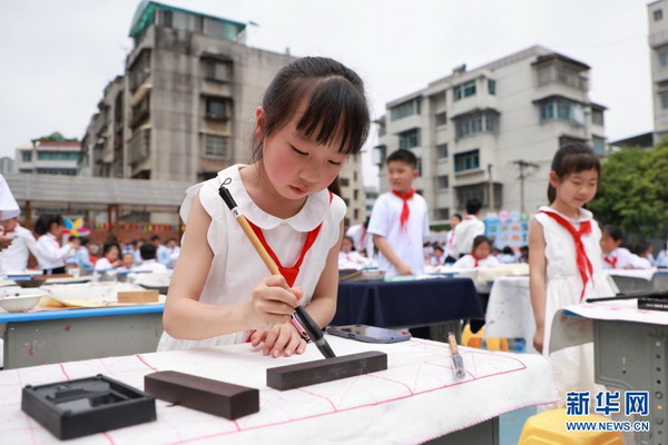 On May 19th, elementary school students are exhibiting calligraphy. Photo by Xinhua News Agency reporter Liu Xu