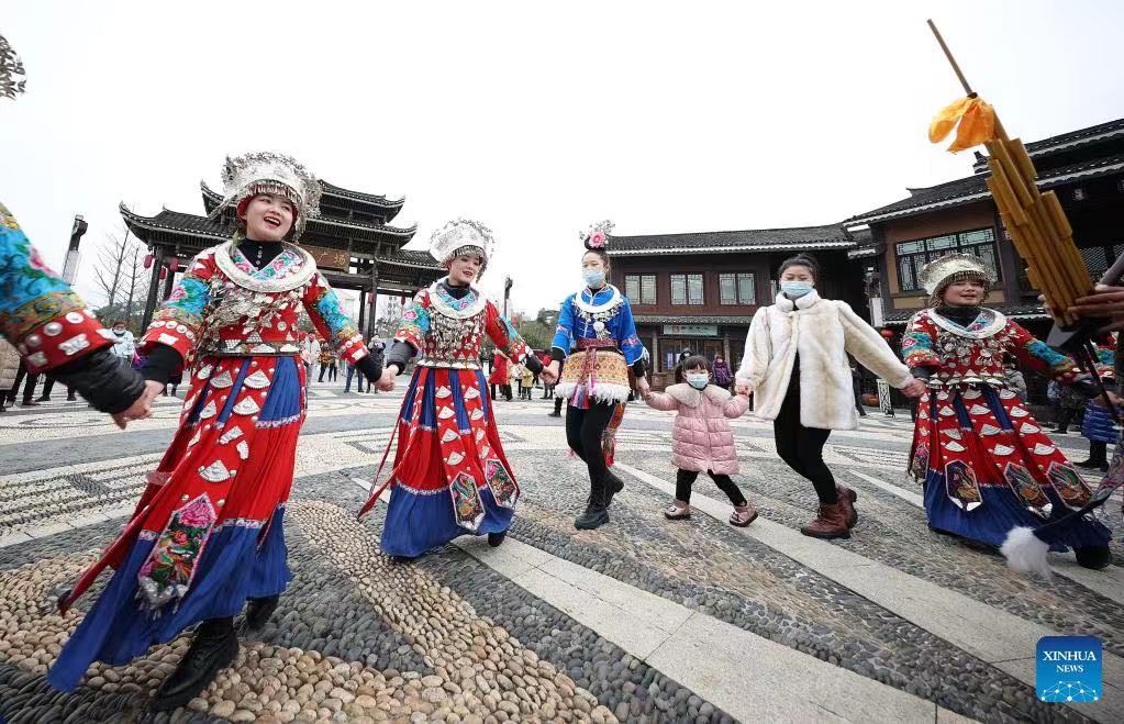 Tourists dance with people of Miao ethnic group at Wanda Town of Danzhai County in Qiandongnan Miao and Dong Autonomous Prefecture, southwest China's Guizhou Province, Feb. 13, 2022. Various events are held across China to celebrate the upcoming Lantern Festival. (Photo by Huang Xiaohai/Xinhua)