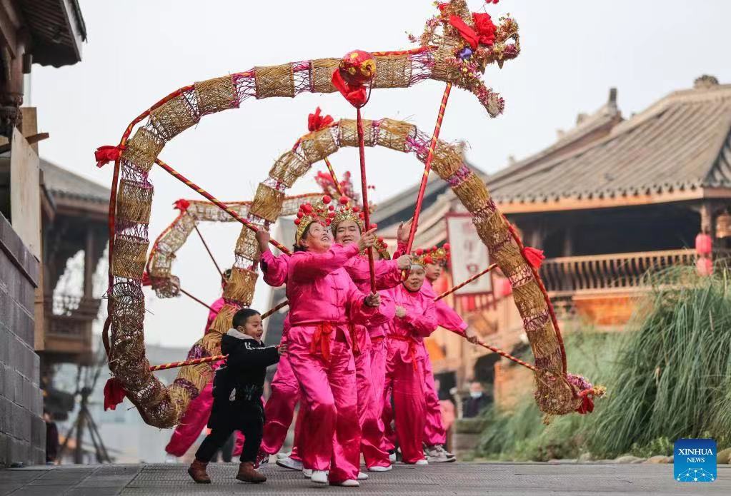 People perform dragon dance in Lizhuang Township, Yibin City of southwest China's Sichuan Province, Feb. 13, 2022. Various events are held across China to celebrate the upcoming Lantern Festival. (Photo by Zhuang Geer/Xinhua)