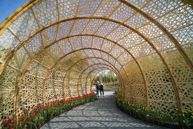 The main entrance of Bamboo Garden is shaped like bamboo slips, and the design is inspired by bamboo slip books in ancient China. This year marks the 50th anniversary of the establishment of diplomatic relations between China and the Netherlands. On both sides of the entrance of the bamboo garden, red and yellow tulips, the national flower of the Netherlands, are planted, implying that the friendship between China and the Netherlands will last forever.