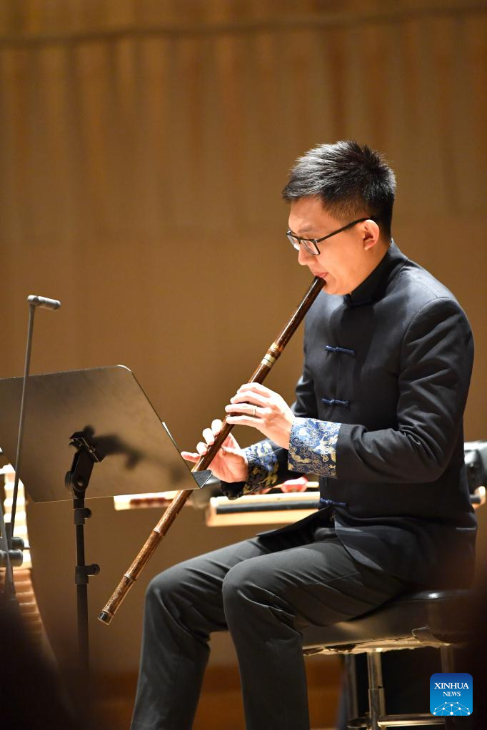 Performed with traditional Chinese musical instruments, "A Moonlit Night on the Spring River," as the concert's opening piece, captivated the audience with its understated and elegant melody. Ahead of the performance, Yang Jing, the traditional Chinese instrument pipa player, introduced this classical Chinese music piece, whose title originated from a long poem written by Chinese poet Zhang Ruoxu of the Tang Dynasty.