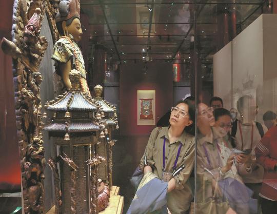 A visitor views a sandalwood statue of Avalokitesvara Bodhisattva at the central gallery of the Meridian Gate of the Palace Museum in Beijing on Friday. (PHOTO by JIANG DONG/CHINA DAILY)