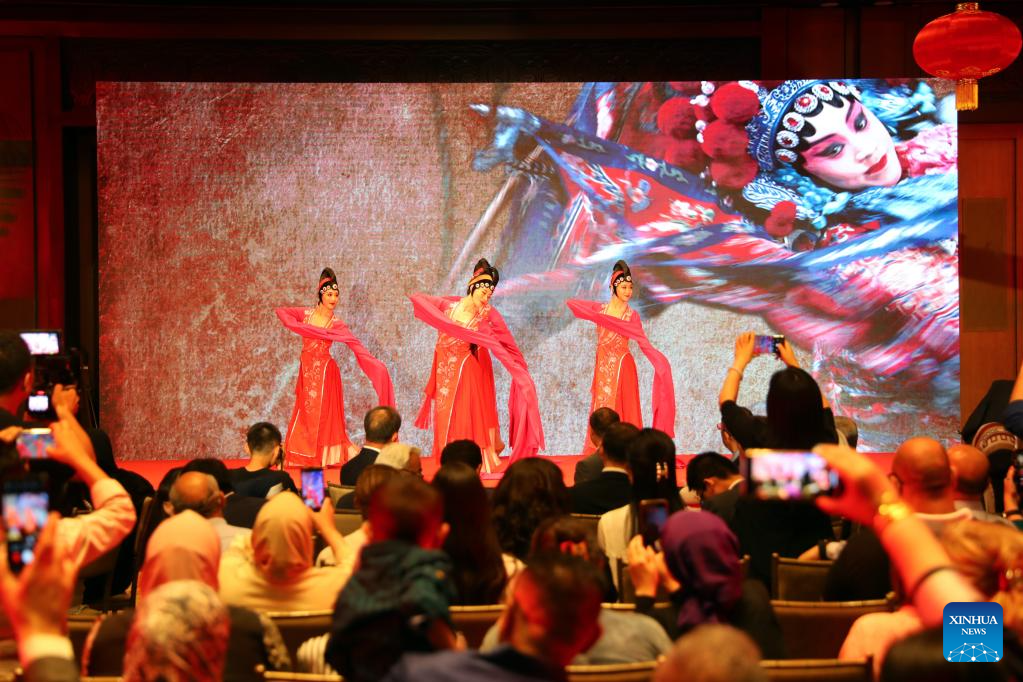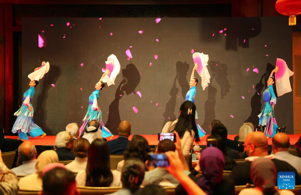 People watch traditional Chinese dance performance at a Chinese tea culture event in Cairo, Egypt, on May 25, 2023. A tea-themed cultural salon was held on Thursday in the Egyptian capital of Cairo, with more than 200 people gathering to taste famous Chinese tea, experience tea-making art, and enjoy cultural performances. (Xinhua/Sui Xiankai)