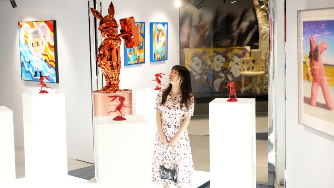 A visitor is attracted by a sculpture at an ongoing exhibition titled "Rabbit in the Eyes of 21 Artists" at the Art Design Center in Luohu District on Thursday. The center is a subvenue of the 19th China (Shenzhen) International Cultural Industries Fair.
