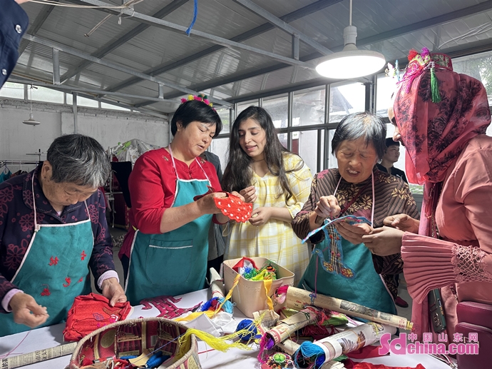 In addition to learning the culture of the county, the activity also brought expats to feel local customs. They stepped into Qianwangzhuang Village, which can be traced back 500 years ago and now with over 100 houses reserved. Wandering around the village, they saw several small shops with a strong sense of living, and appreciated an intangible cultural heritage exhibition, where they experienced embroidery crafts. Meanwhile, expats came across a study group from a local middle school, sharing and communicating their ideas of rural revitalization, social development and global culture exchanges.