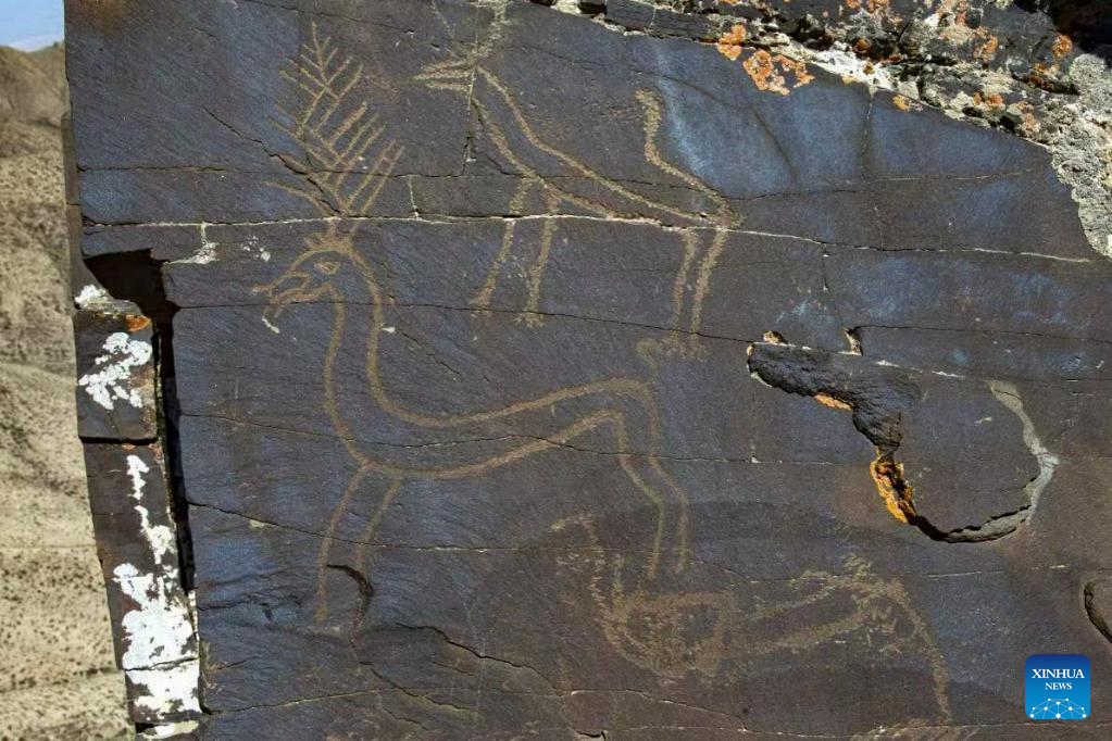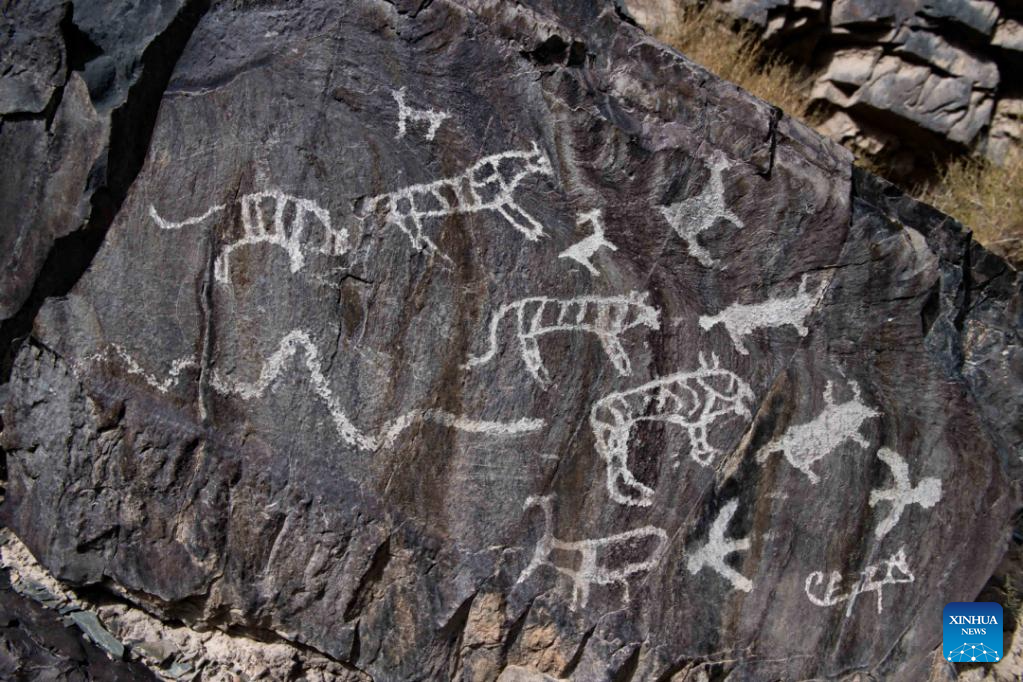 This undated file photo shows a rock painting featuring animal figures in Subei Mongolian Autonomous County, northwest China's Gansu Province.