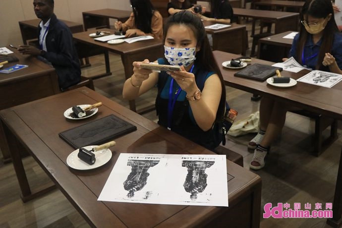 At Zhonghua Family Culture Museum, foreign students learned about Chinese classics and the usage of ancient Chinese sundials, rulers, and scales. They showed great interest in these unfamiliar traditions. Regarding rubbings, PHOMPIDA SAENGTAVANH from Laos said, "I found the ancient rubbing technique very interesting. It is similar to the copiers used by modern people. The ancient Chinese people were so clever that they came up with this method of printing patterns in ancient times."