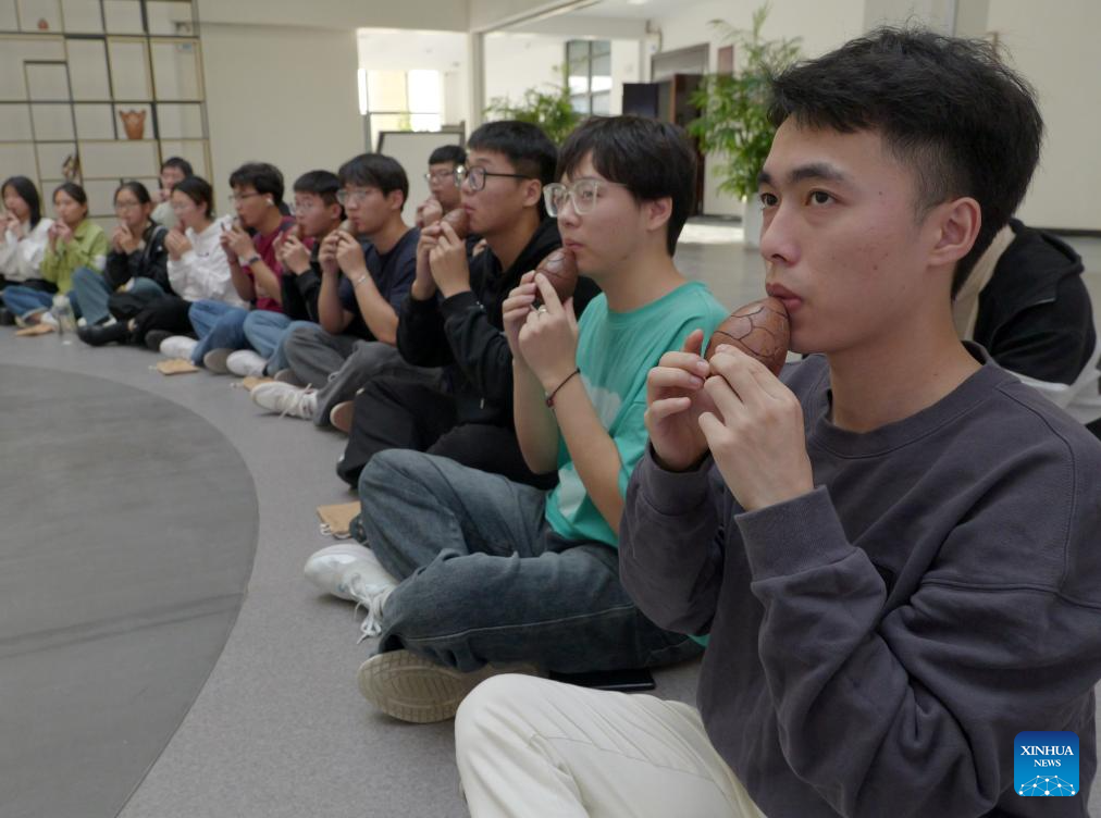 Students practice pottery Xun playing at the Huanghe Cultural Center of Huanghe Jiaotong University in Wuzhi County, central China's Henan Province, Oct. 31, 2023. (Xinhua/Li Jianan)