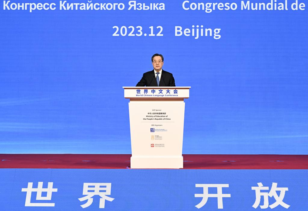 Ding Xuexiang, a member of the Standing Committee of the Political Bureau of the Communist Party of China (CPC) Central Committee and vice premier of the State Council, attends the 2023 World Chinese Language Conference and delivers a keynote speech in Beijing, capital of China, Dec. 9, 2023. (Xinhua/Zhang Ling)