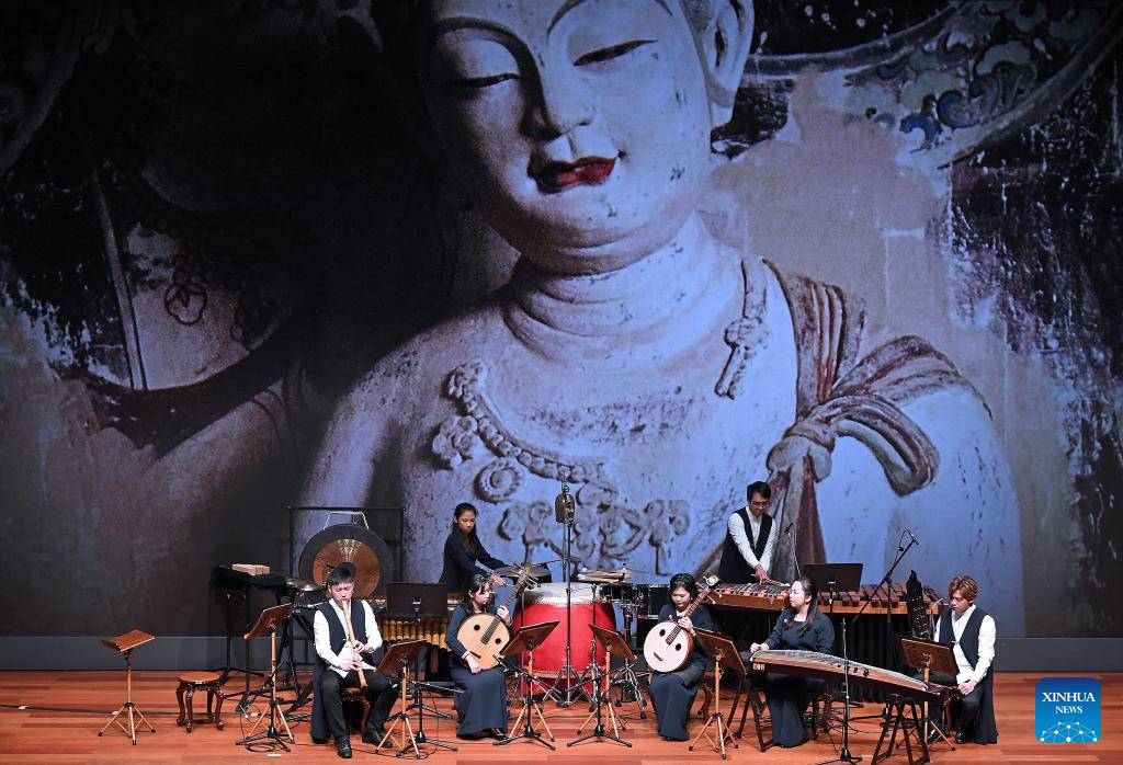 Members of the Hong Kong Gaudeamus Dunhuang Ensemble perform during the opening of the "Hong Kong Palace Performing Showtime Carnival" in Hong Kong, south China, Nov. 26, 2023. (Xinhua/Chen Duo)
