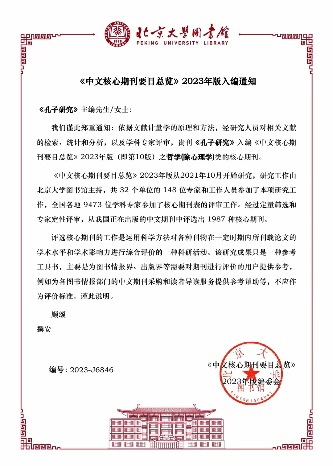 Recently, the editorial department of Confucius Studies received a notice from the editorial board of Guide To The Core Journals of China(2023 Edition)that Confucius Studies will be included as a core journal of the philosophical category (excluding psychology)in 2023 edition (i.e. the 10th edition).