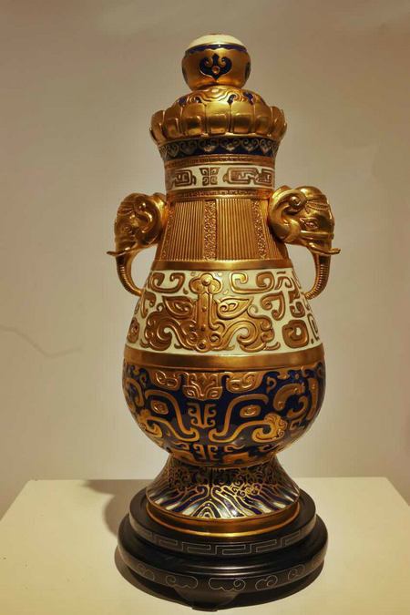 Named Shengshi Hefeng, or Prosperity and Harmony, the black, blue and gold vase, which resembles the pear-shaped instrument, combines the traditional techniques of cloisonne and filigree inlay.