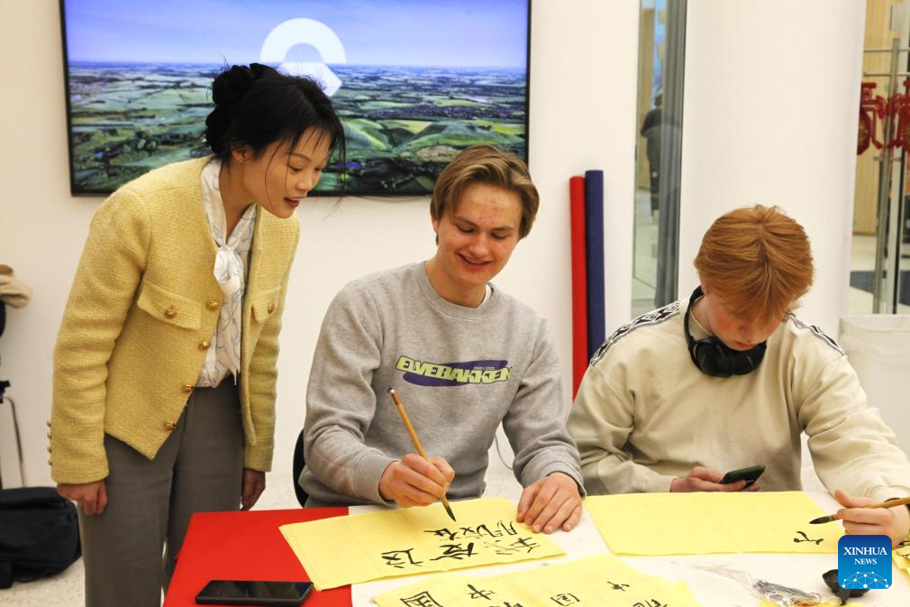 Local people practice Chinese calligraphy in Oslo, capital of Norway, on April 20, 2024. A series of activities have been held in Norway to celebrate the United Nations Chinese Language Day, attracting a large number of participants. (Xinhua/Zhang Yuliang)